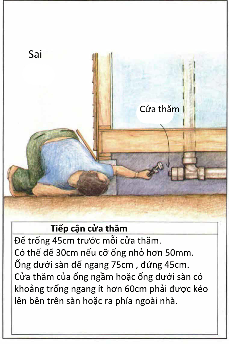 Điều này thường xuyên sảy ra . Cửa thăm được lắp đặt đúng cách phải cho phép người thợ tiếp cận được và phải có đủ không gian để làm việc . Khoảng trống ít nhất từ 30 đến 45 cm .
