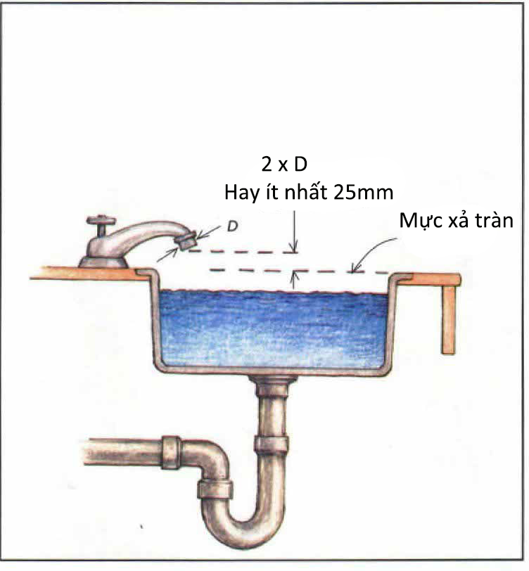 Để đảm bảo nước thải không bị hút ngược trở lại đường cấp nước , khoảng trống nhỏ nhất cần phải được duy trì giữa vòi nước và lỗ xả tràn của thiết bị ( bồn rửa ).