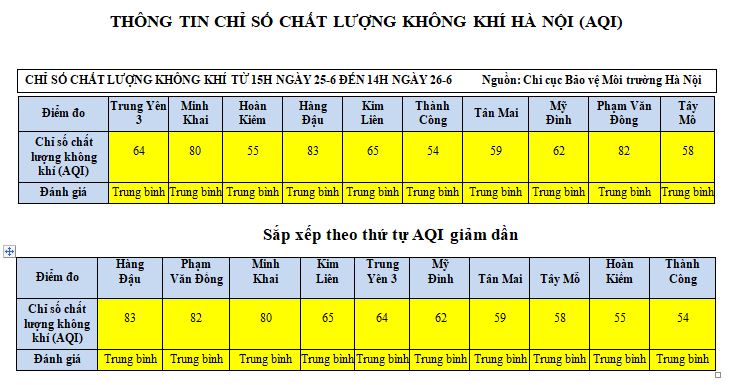 Cụ thể các trạm: Trung Yên 3: 64 (Trung bình); Minh Khai – Bắc Từ Liêm: 80 (Trung bình); Hoàn Kiếm: 55 (Trung bình); Hàng Đậu: 83 (Trung bình); Kim Liên: 65 (Trung bình); Thành Công: 54 (Trung bình); Tân Mai: 59 (Trung bình); Mỹ Đình: 62 (Trung bình); Phạm Văn Đồng: 82 (Trung bình); Tây Mỗ: 58 (Trung bình).