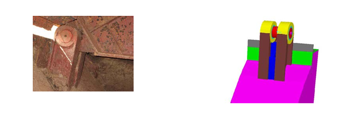 Gối bản lề được ghép bằng hai thép hình chữ I 190×100 để đỡ trục quay rồi dùng hệ thanh liên kết với móng bằng bê tông cốt thép. Đã qua nhiều năm tồn tại trong môi trường khi ngập nước, khi khô, thép gối bản lề bị ăn mòn có chỗ vết rỗ sâu tới 6mm, còn mối hàn cũng bị hao mòn chiều cao (hình 1). Bạc và trục quay không được bôi trơn bằng dầu mỡ chủ yếu là bôi trơn bằng nước tự nhiên. Khi cạn nước vận hành cửa lên xuống để bảo dưỡng do bề mặt tiếp xúc giữa trục và bạc sinh ra ma sát trượt lớn. Toàn bộ các tấm chặn trục 60x130x10 trên mặt đầu chốt xoay hoặc bị mất hoặc bị gãy không còn tác dụng chặn trục[2].