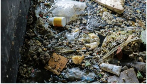 Kim tiêm lẫn rác thải và đồ nhựa khó phân hủy nổi lềnh bềnh trên mặt nước