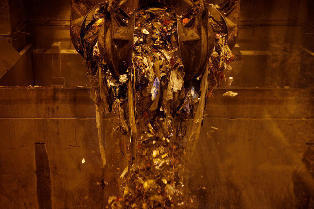 Đầu tiên, xe tải mang rác (đã cân khối lượng) đến nhà máy. Toàn bộ rác được dồn vào hầm chứa đặc biệt, được thiết kế để ngăn mùi hôi thối bốc ra.