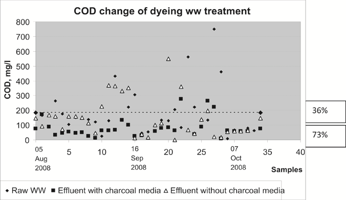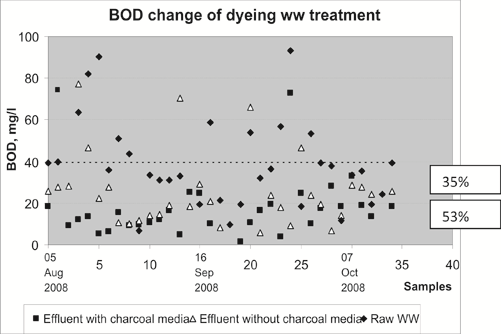 Trong môi trường xử lý vi sinh có than làm giá thể dính bám, hiệu quả xử lý BOD (lấy qua giá trị trung bình) tỏ ra có ưu thế hơn hẳn 1,5 lần (53% so với 35%) khi không có than, thể hiện qua (Hình 3).