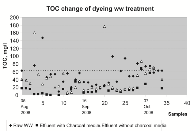 Several technologies such as ozone [2, 3], combination of ozone and biological system [2], membrane and electrochemical technology [4-7] have been studying by Vietnamese and international researchers in order to treat wastewater from dying industry. However, the studied methods have their own limitations. The Institute of Environmental Technology has carrying out the study on dyeing wastewater treatment using carbonized carbon as biological charcoal media. This paper aims to describe the experiment of wastewater treatment in Pho Noi Garment and Textile Industrial Park and Nam Long Texttile Company in Thai Binh province. The results showed that, the rate of COD, BOD and TOC removal of system using carbonized carbon media would be 1.5 – 2.7 times higher than that of system without media.