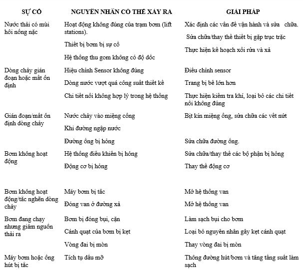 Vận hành nước thải cần phải làm quen với các chỉ số hoặc quan sát đặc trưng của hệ thống thu gom và / hoặc trạm bơm có vấn đề / hư hỏng. Nói chung, những vấn đề điển hình này được nhận biết thông qua kinh nghiệm. Cùng với việc xác định các vấn đề hệ thống thu gom và trạm bơm, các nhà điều hành cũng phải biết các hành động khắc phục thích hợp để có cách khắc phục vấn đề. Một lần nữa, khả năng này đi kèm với đào tạo và kinh nghiệm. Trong bảng 5.1, chúng tôi liệt kê một số các chỉ số / quan sát đặc trưng của hệ thống thu gom và vấn đề trạm bơm, nguyên nhân có thể xảy ra, và các hành động khắc phục.
